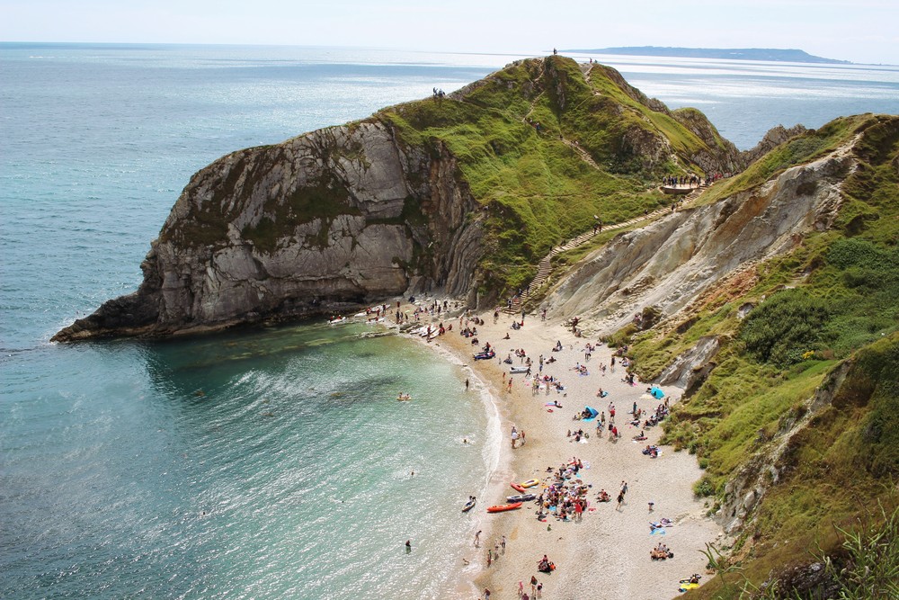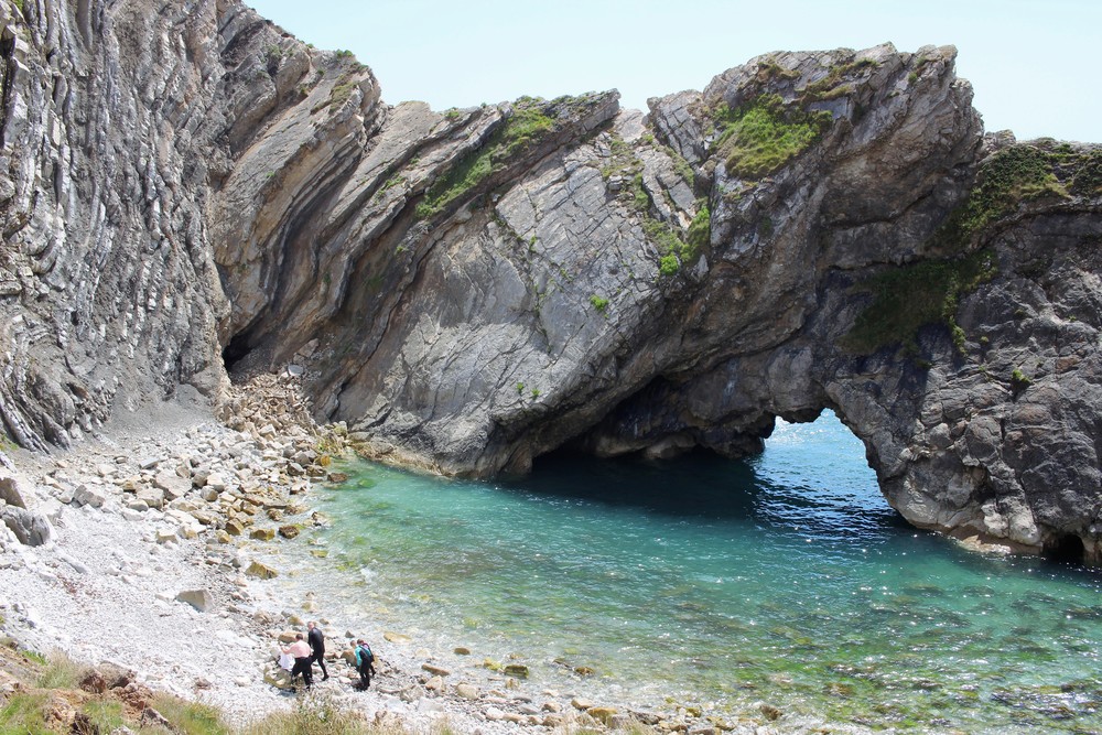 The same path that leads up to a view of the cove also leads to the Stair Hole, another small cove to the west of Lulworth. At the Stair Hole, you can see the Lulworth Crumple, which is a rock formation where the layers of stone form an S-shape.