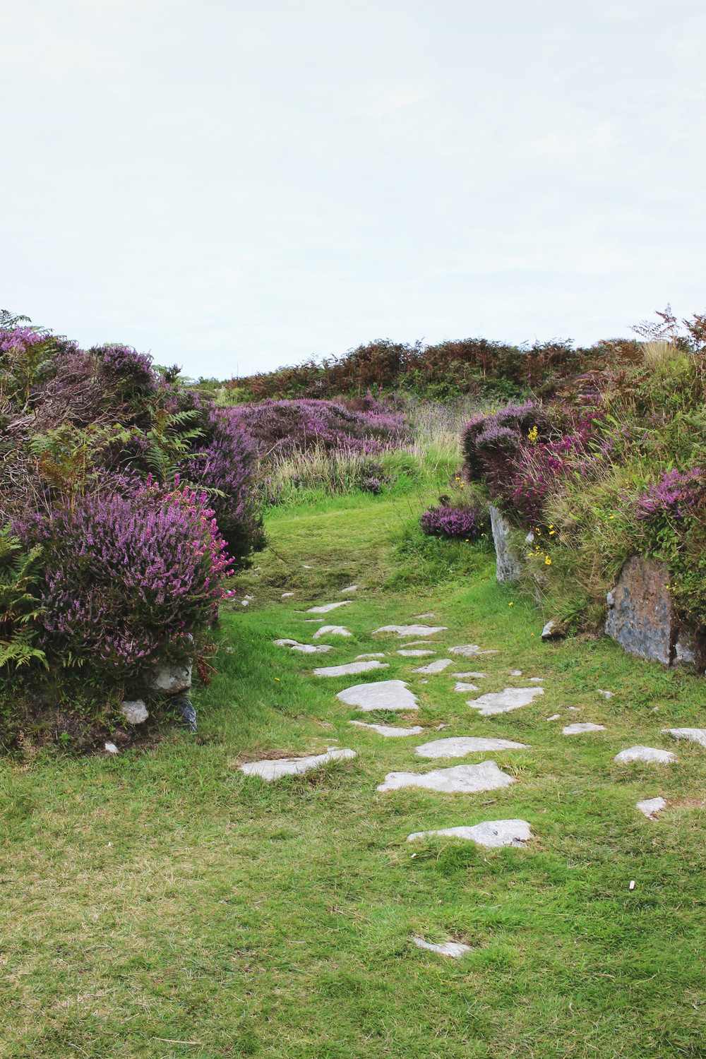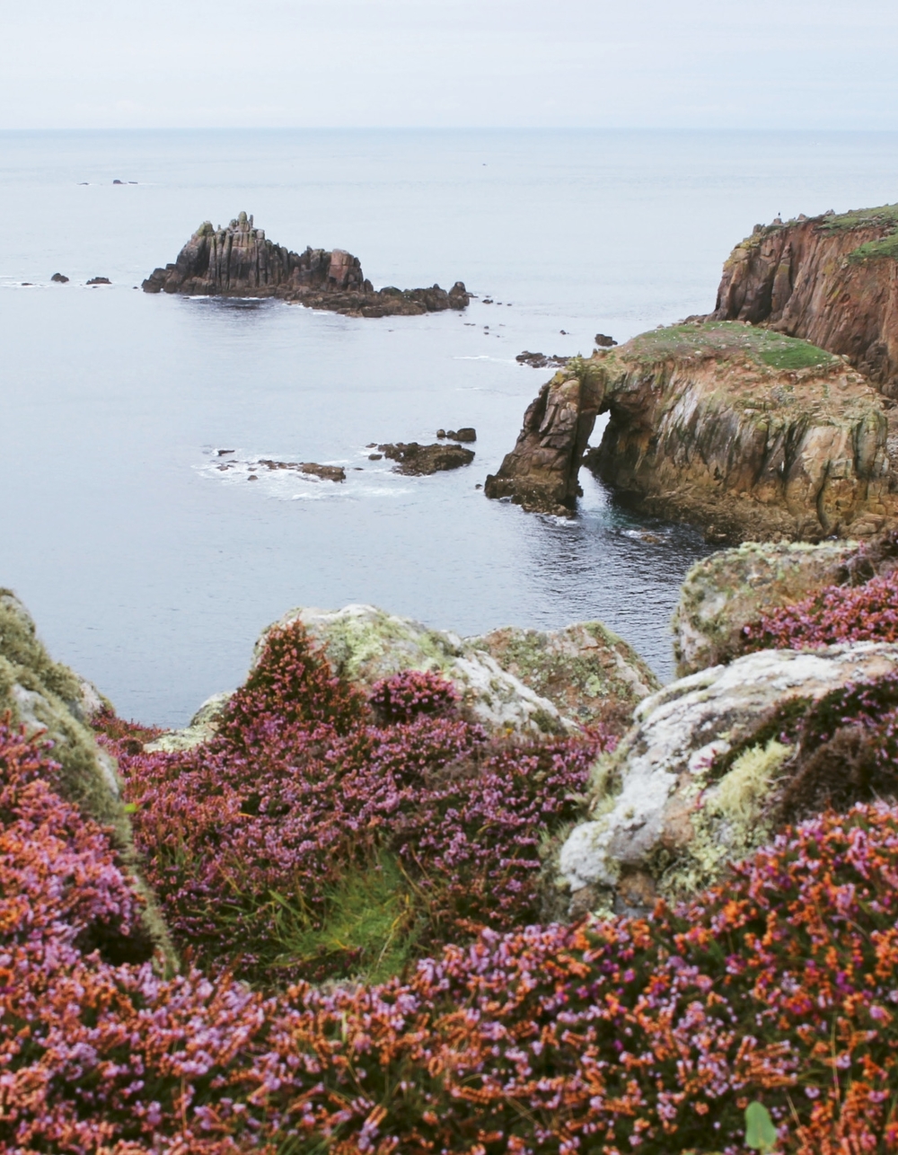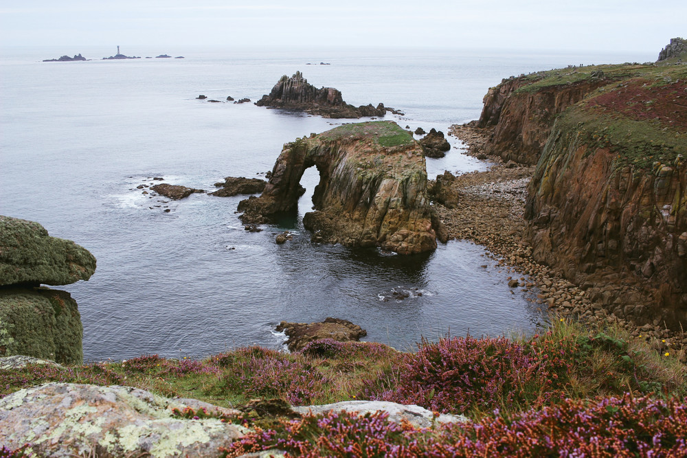 Later on Sunday, we drove to Land’s End as it had mostly stopped raining. We didn’t want to come all that way and not see Britain’s most south-westerly point! The photo above was taken along the South West Coast Path at a natural arch called Enys Dodnan with the Armed Knight sea stack in the distance. The pink heather completely covered the ground and it was crazy beautiful.